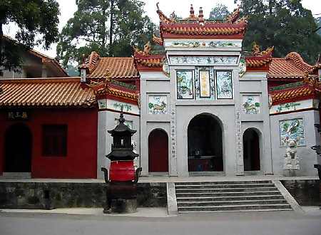 在岳麓山半腰,系晉初古寺,是佛教人湘最早的一所大寺。明神宗時(shí) 更名為萬壽寺,民國初年復(fù)名,古麓山專。唐代大詩人杜甫曾用“寺門高開 洞庭野,殿腳插入赤沙湖”的詩句稱頌殿字宏大。大雄寶殿等主要建筑,于 1944年被炸毀,僅存山門和觀音閣,現(xiàn)已修整一新.山門上有“古麓出寺” 的橫額,兩旁為“漢魏最初名勝,湖湘第一道場"對(duì)聯(lián),門外古楓參天,濃 蔭覆蓋,門內(nèi)園圃百花爭艷。觀音閣為磚木結(jié)構(gòu),1955年曾加以修葺,1980 年再次修整恢復(fù)原貌,并在廳堂神龕中置觀音像。閻內(nèi)常舉辦小型書畫展 覽。觀音閣前有兩株羅漢松,左邊一株是六朝遺跡,稱“六朝松",樹 齡在1700年以上, 是岳麓山植物界的"元老", 老干新枝,紛繁翁 郁,彌足珍貴;右邊一株于清代被巨風(fēng)拔去并被清代人補(bǔ)植。兩棵古松 并峙于閣前,游人樹下經(jīng)過,若入關(guān)隘,故有“關(guān)松"之稱。