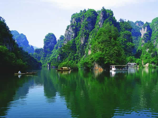 寶峰湖瀑布 湖中有兩座疊翠小島,近岸奇峰屹立,峰回水轉(zhuǎn)。泛舟漫游,只見一湖綠水半湖倒影,充滿詩情畫意。“云梯萬丈上天臺(tái),高峽平湖一鑒開,王母瑤池金扶,浣沙仙女下凡來”游寶峰湖,你就會(huì)欣賞到這樣的詩情畫意。群峰擁抱的寶峰湖,長約2.,5公里,湖猶如一面寶鏡,四面青山,一泓碧水,蕩槳溫游,格外愜意。坐在船上,環(huán)顧四周,千山聳翠,俯視水中,倒影慢移,碧水照相館得群峰綠,人面桃花水映紅。真是靜極了,美極了!韓劇《九天洞》拍攝的湖水就是寶峰湖。