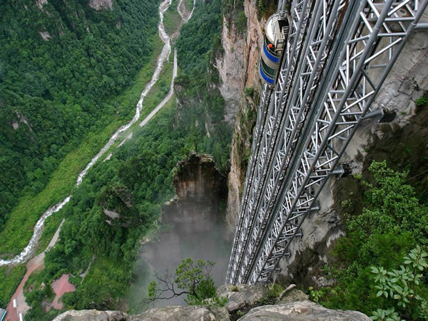 百龍電梯位于世界自然遺產(chǎn)張家界武陵源風(fēng)景區(qū)。工程分布在4.5公里,垂直高差385米的核心景區(qū)。電梯運(yùn)行高度326米,主體由154米山體豎井和172米貼山鋼結(jié)構(gòu)井架等組成,采用三臺雙層全暴露觀光電梯并列分體運(yùn)行。是連通森林公園、金鞭溪、水繞四門到袁家界、烏龍寨、天子山的重要觀光交通設(shè)施。百龍?zhí)焯莨こ毯陚、工藝?fù)雜,施工驚險(xiǎn),堪稱“世界工程奇觀”。它的建成創(chuàng)造了三項(xiàng)基尼斯世界紀(jì)錄。