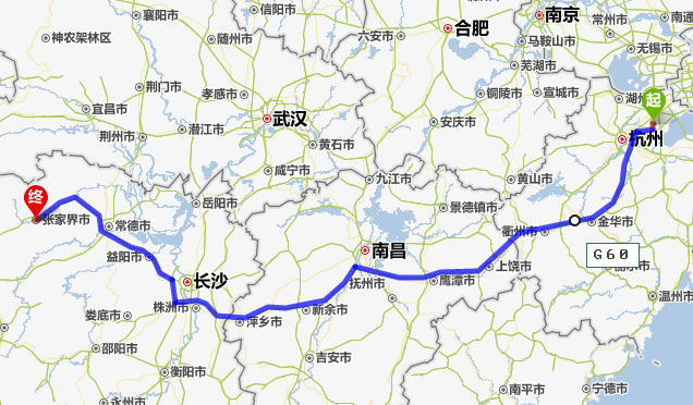 左右,沿途經過海寧——杭州——桐廬縣——建德市——衢州市——上饒市——鷹潭市——新余市——宜春市——萍鄉(xiāng)市——株洲市——湘潭市——寧鄉(xiāng)縣——益陽市——常德市——慈利縣——張家界。